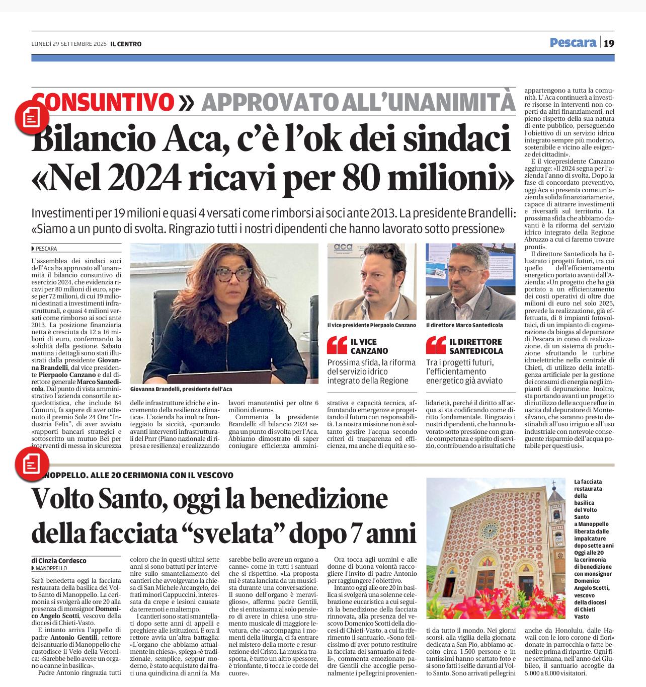 Soddisfatto anche il vice presidente Canzano: “Il 2024 segna per l’azienda l’anno di svolta, dopo la fase di concordato preventivo che l’azienda ha affrontato in maniera brillante oggi ACA si presenta come un’azienda efficace e solida finanziariamente capace di attrarre investimenti e riversarli sul territorio che ricordiamo è il più grande della regione Abruzzo. La prossima sfida che abbiamo davanti è la riforma del servizio idrico integrato della regione Abruzzo a cui ci faremo trovare pronti”.